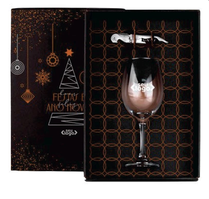 Taça de vidro para vinho com capacidade de 490ml e abridor saca-rolhas em aço inox escovado.